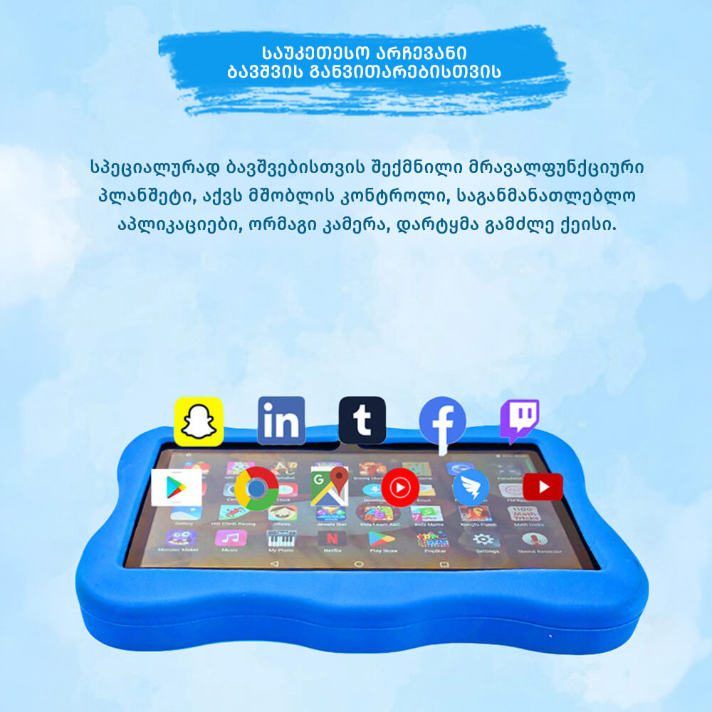 სპეციალურად ბავშვებისთვის შექმნილი მრავალფუნქციური პლანშეტი, Android 13, აქვს 32 + 2GB მეხსიერება, მშობლის კონტროლი, საგანმანათლებლო აპლიკაციები, ორმაგი კამერა, დარტყმა გამძლე ქეისი. საუკეთესო არჩევანი ბავშვის განვითარებისა და გართობისათვის